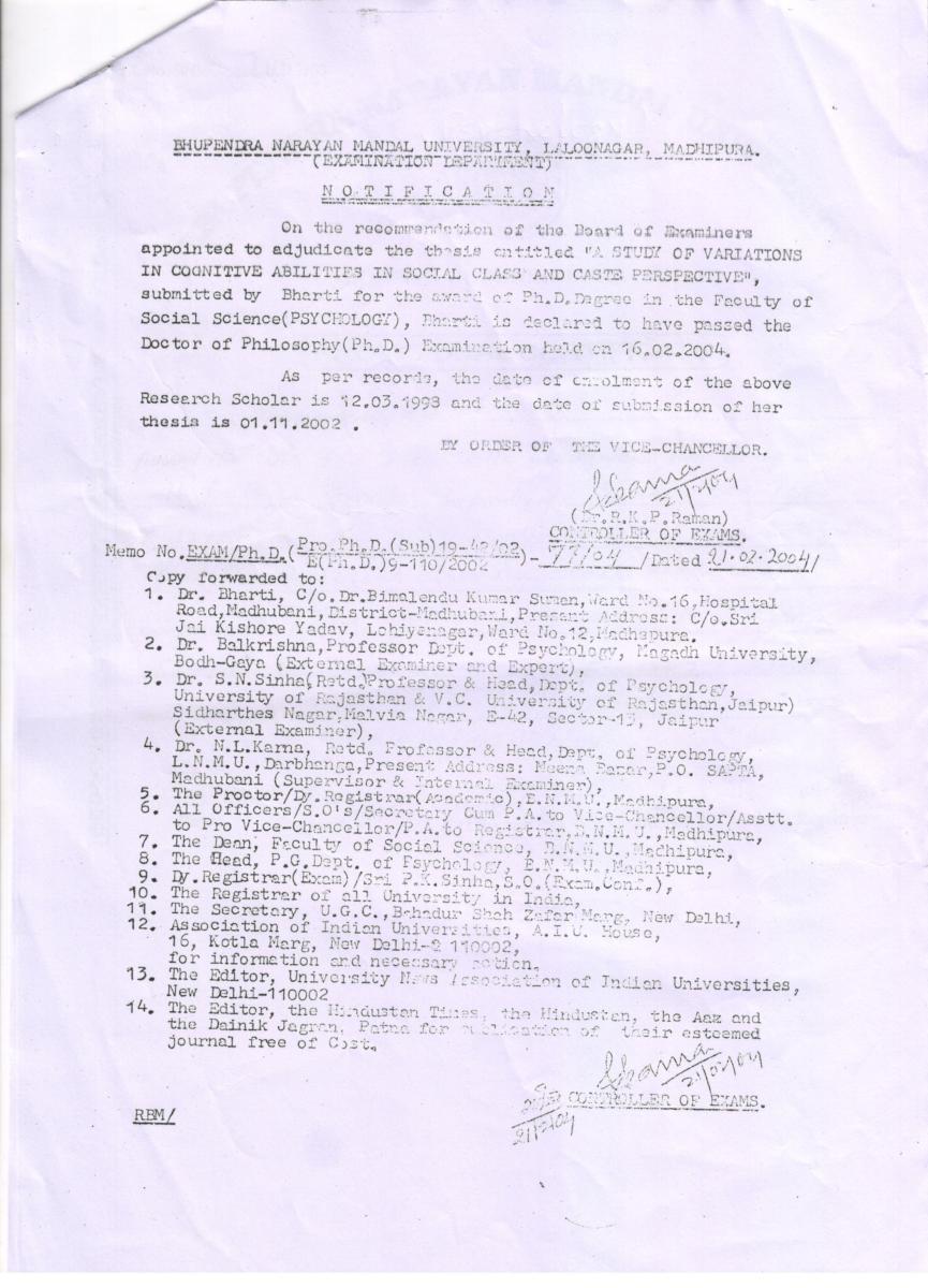Letter for B.Ed. Course (Govt. of Bihar)